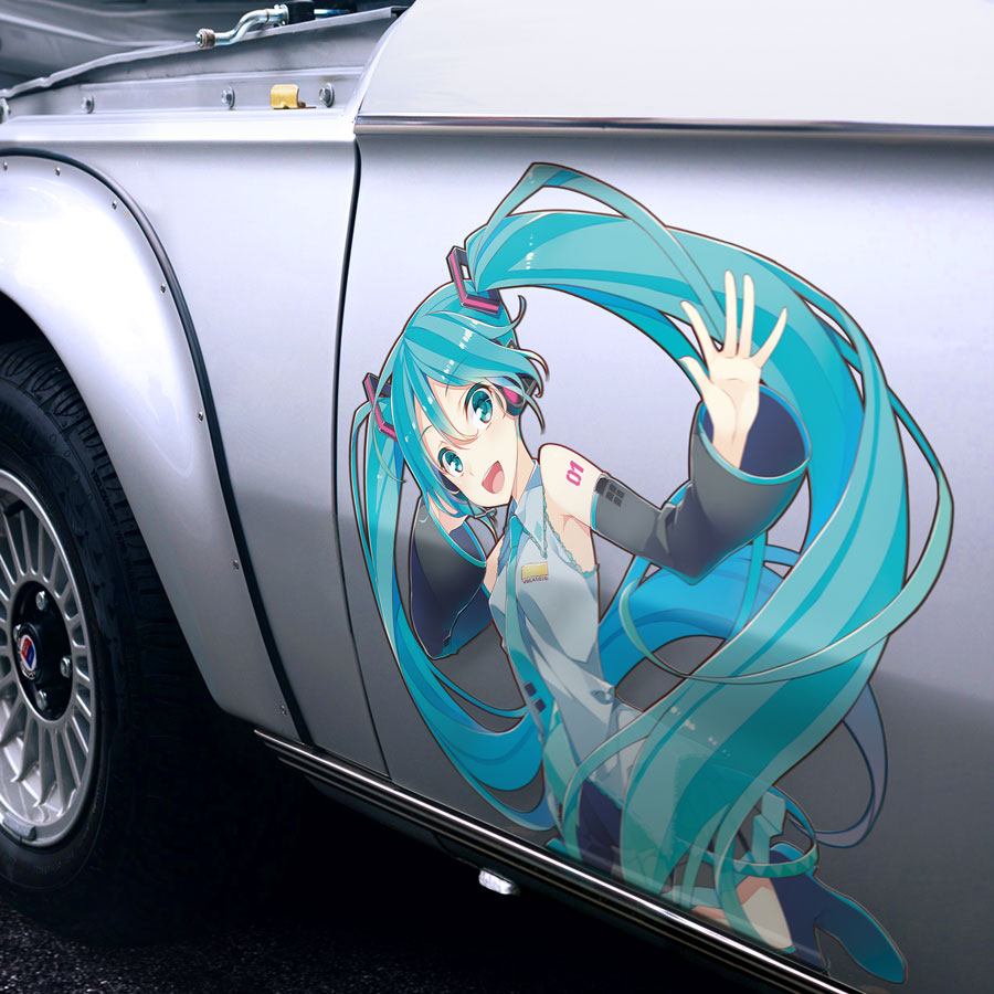 2x Pair Side Miku 01 Vocaloid Virtual Idol Singer Diva Cyan Twin-Tail Hologram Pop Star Weeb Otaku Waifu Anime Manga Girl Printed Car Vinyl Sticker Decal