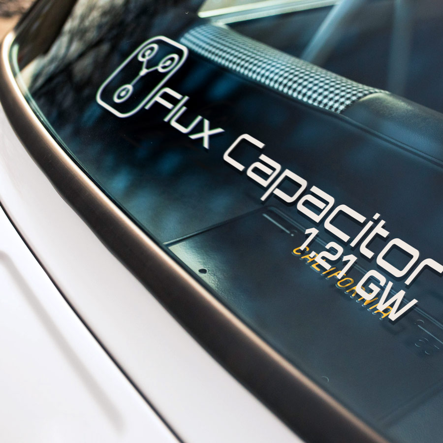2x Pair Flux Capacitor 1.21 Gigawatts DMC-12 Time Machine Clock Tower Lightning McFly Doc Emmett Brown Almanac Car Vinyl Sticker Decal