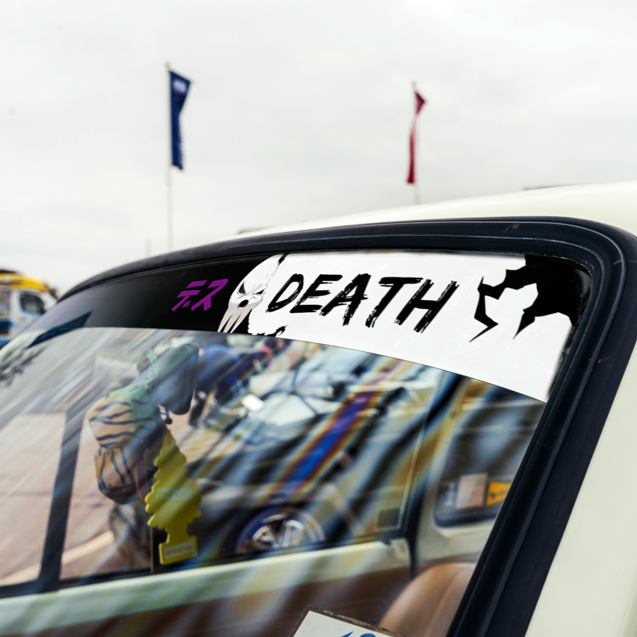 60" Death v1 Reaper Weapon Great Old One Lord Shinigami Meister Academy デス Desu Skull Anime Manga Sun Strip Printed Windshield Car Vinyl Sticker Decal