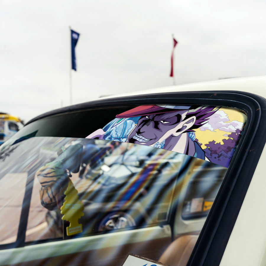 60" Jotaro Kujo V1 Stand Star Platinum Cap Golden Hand Symbol Chain Menacing Manga Anime Sun Strip Printed Windshield Car Vinyl Sticker Decal